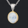 Gewicht: ca. 3,5 g Maße: ca. 22x12 mm / Kettendurchlauf ca. 4x3 mm Feingehalt/ Punzierung: 925/- Silber rhodiniert|vergoldet Edelstein: Rainbow Mondstein aus Tansania Farbe: weiß mit Schimmer Steingröße: ca.11,8x9,8 mm ( ca. 3,6 ct.) Schliffart: oval, Cabochon UVP: 139,- €